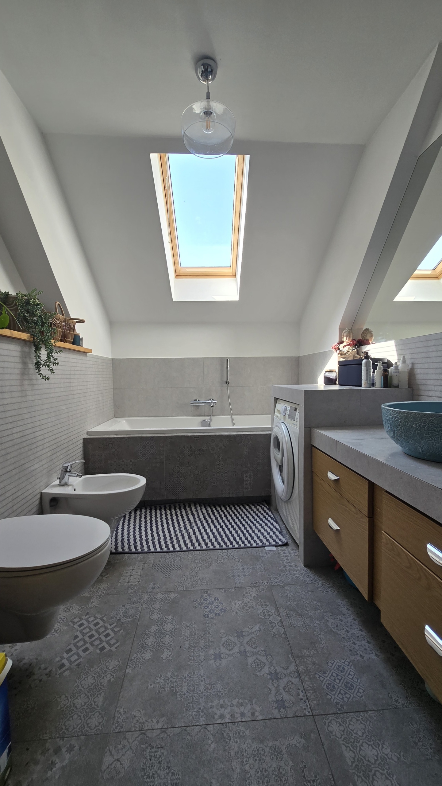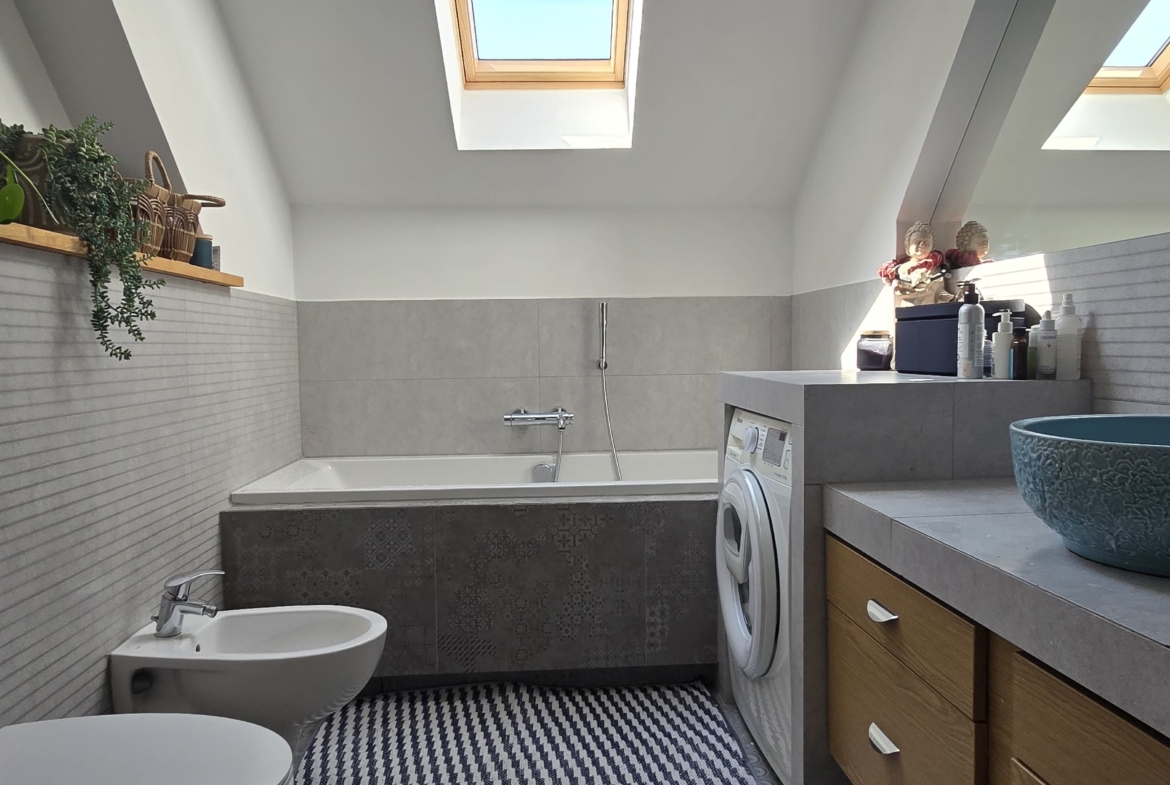 - Łazienka – wyposażona w wannę (180 cm), toaletę, bidet, umywalkę i pralkę.
