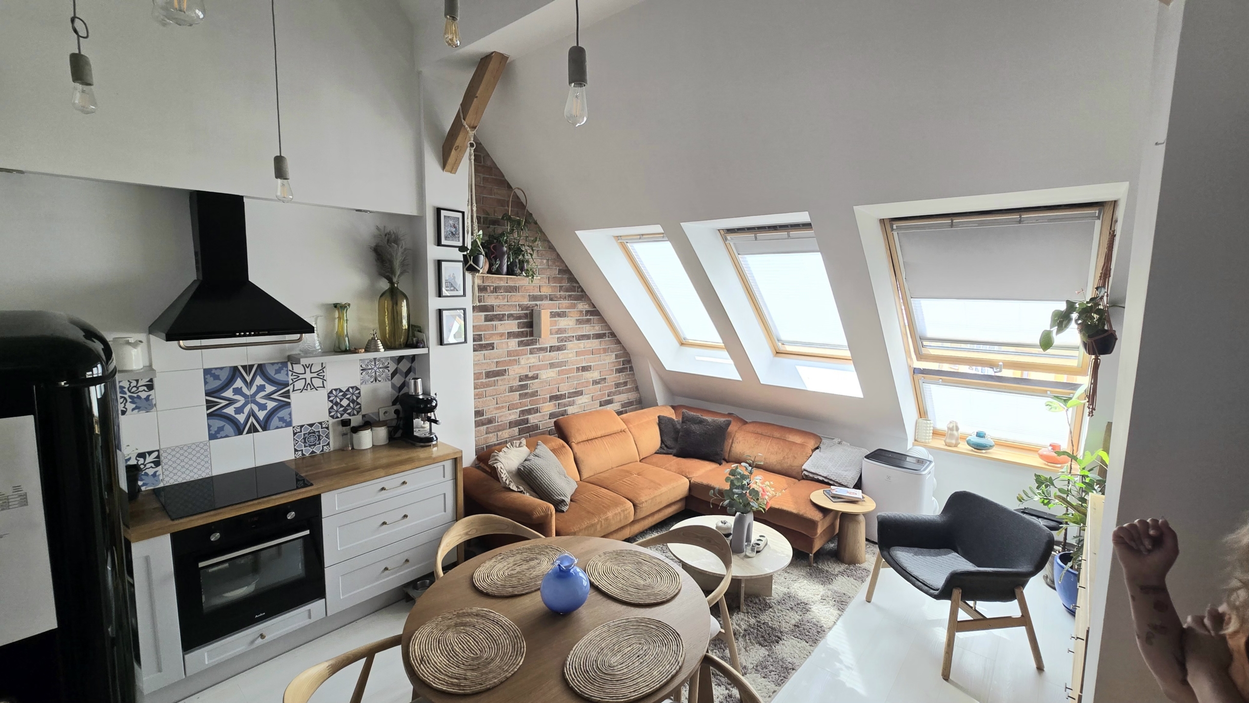 - Salon z aneksem kuchennym – przestronny, z dużym oknem, które tworzy balkon.